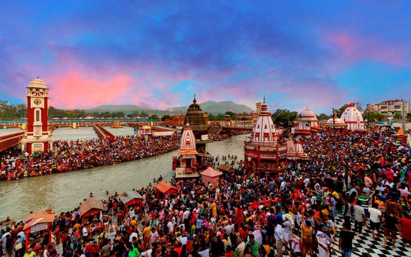 Haridwar is an ancient city and important Hindu pilgrimage site in North India's Uttarakhand state, where the River Ganges exits the Himalayan foothills. The largest of several sacred ghats (bathing steps), Har Ki Pauri hosts a nightly Ganga Aarti (river-worshipping ceremony) in which tiny flickering lamps are floated off the steps. Worshipers fill the city during major festivals including the annual Kanwar Mela